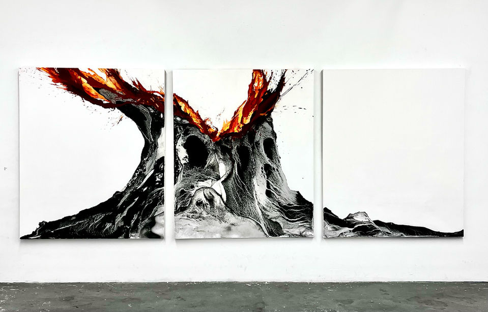 All artworks are created using pigment powder, acrylic, and charcoal on canvas.